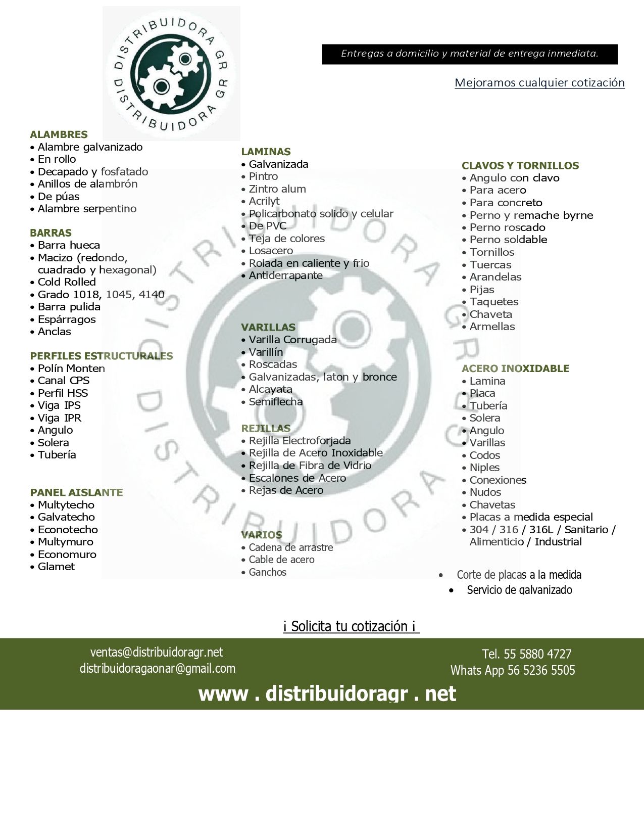 En DISTRIBUIDORA GR, nos adaptamos a tus necesidades para ofrecerte un servicio excepcional. Conoce nuestro catálogo de productos y servicios, diseñado para cubrir todas tus expectativas. Además, nos comprometemos a mejorar cualquier precio, asegurándote siempre la mejor calidad al mejor costo. ¡No esperes más, descubre todo lo que tenemos para ti!